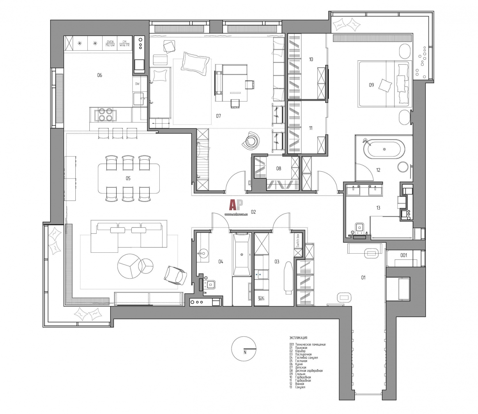 План трехкомнатной квартиры с двумя угловыми панорамными окнами в современной высотке. Общая площадь – 160 кв. м.