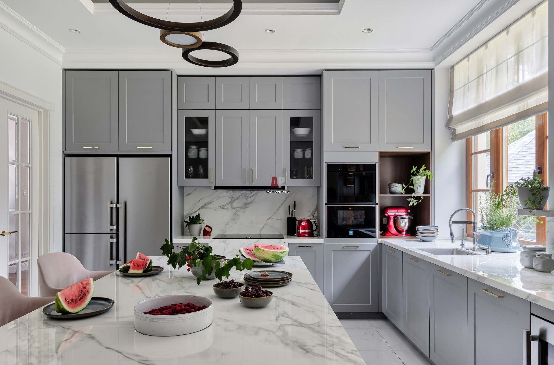 Кухня с многофункциональным островом и рабочей зоной возле окна. Кухонный гарнитур, Hacker Kitchen. Техника, Neff. Светильник, Contardi.