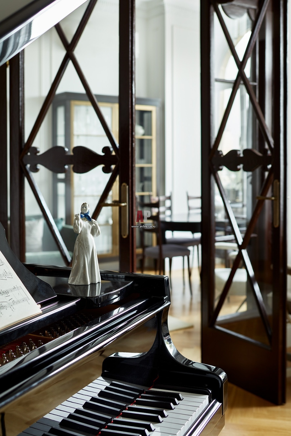 Историческая квартира в доме на Смоленской набережной. Гостиная с историческими дверями.