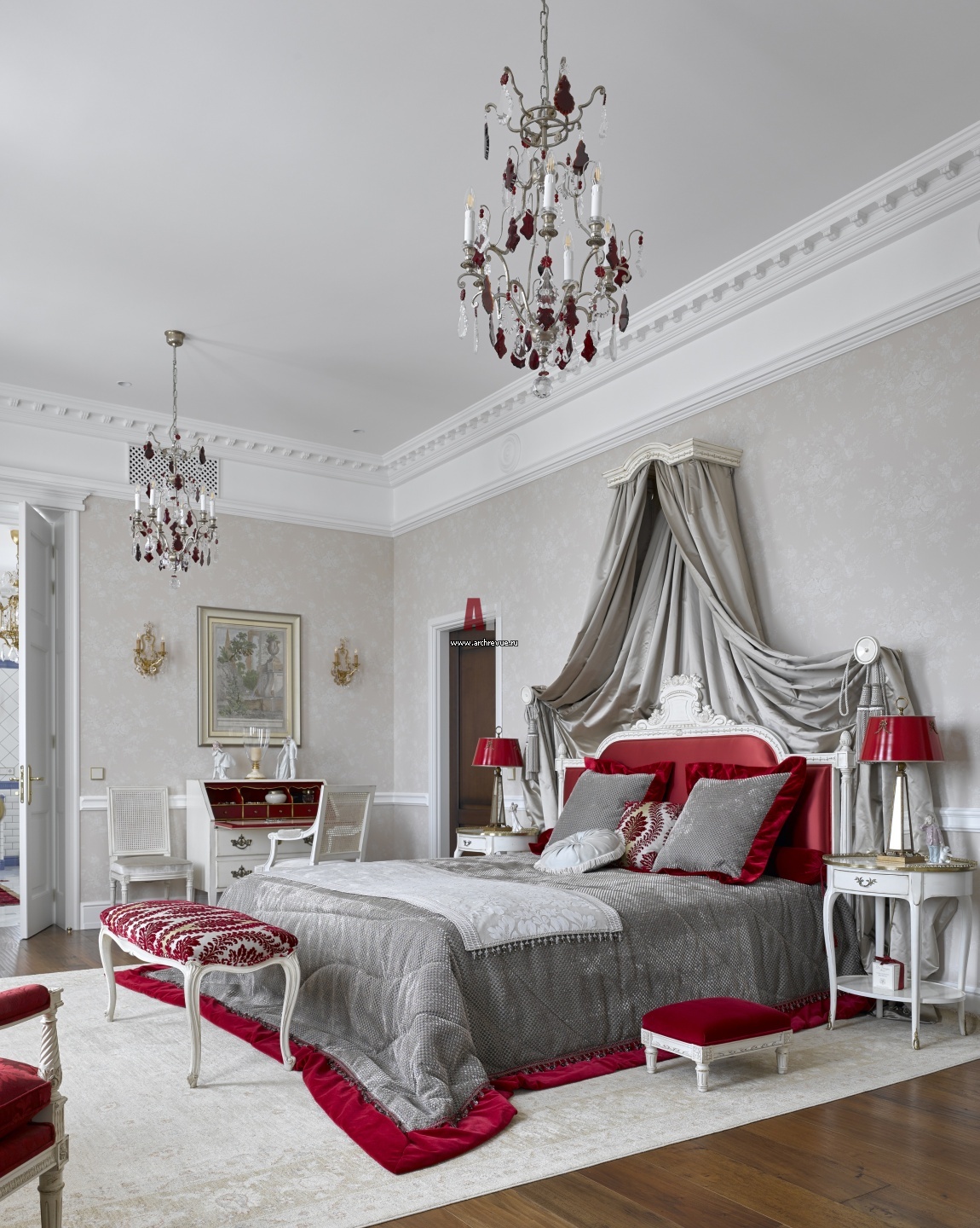 Хозяйская спальня оформлена в серебристой гамме с красными акцентами. Кровать с балдахином, покрывало и подушки, прикроватная тумбочка, Salda. Настольная лампа, Banci.