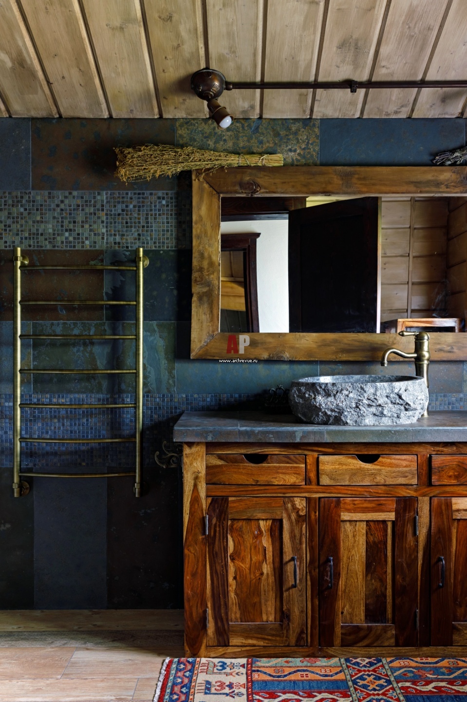 Санузел на втором этаже. Стены оформлены сланцем и декоративной штукатуркой под бетон, фасад умывальника имитирует амбарную доску. Раковина выполнена из цельного камня.