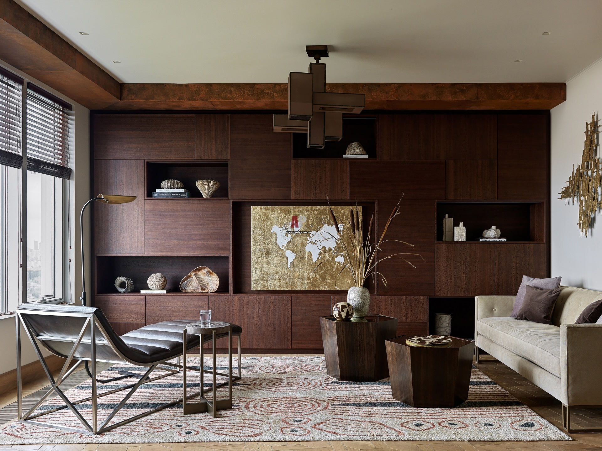 Стеллаж в гостиной маскирует сложную геометрию помещения. Он выполнен по эскизам дизайнера из экзотической древесины тайгервуд насыщенного темного цвета. Комбинация открытых и закрытых секций композиции создает ритм, который подчеркивают панели из картеновской стали и потолочный светильник. Кушетка, диван, столики, Caracole.