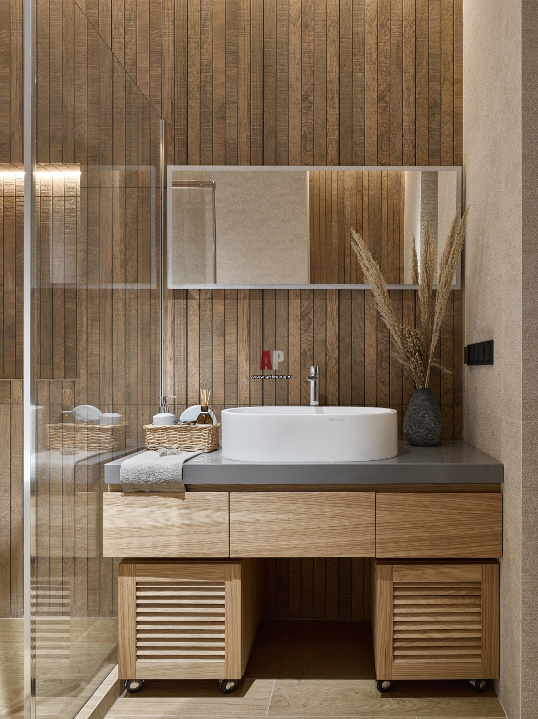 Санузел в отделке светлым деревом с природной фактурой. Умывальник в скандинавском стиле сделан на заказ. Керамическая плитка с имитацией известняка, Porcelanosa. Раковина, Systempool.