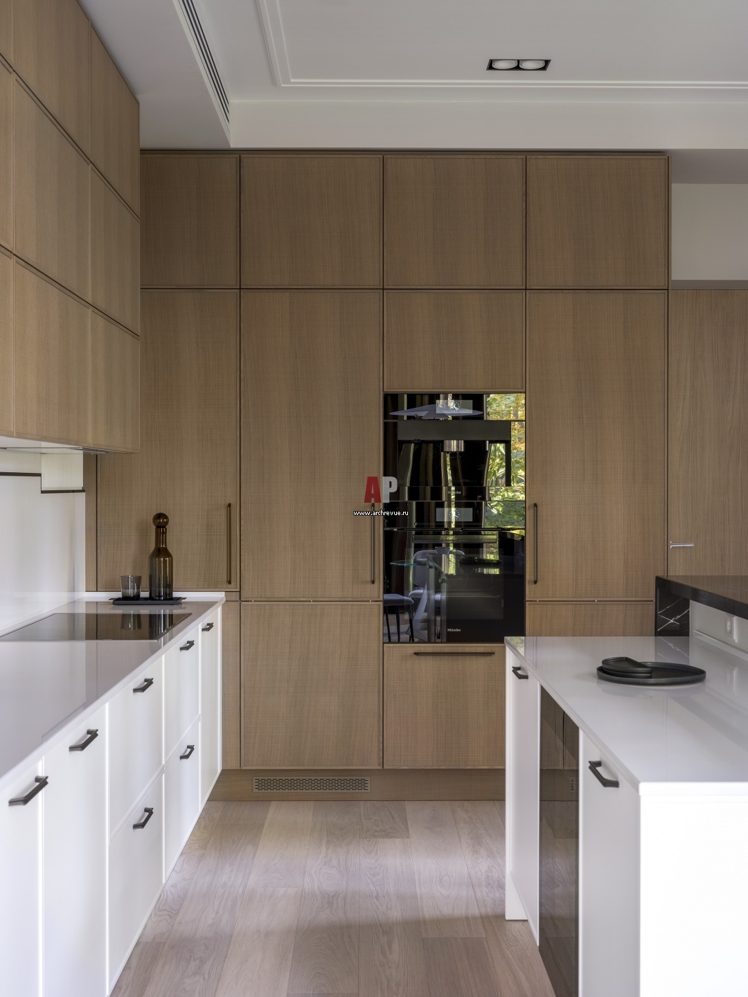 Кухня с островом и барной стойкой, Giulia Novars. Фасады – дубовый шпон и белый лак.