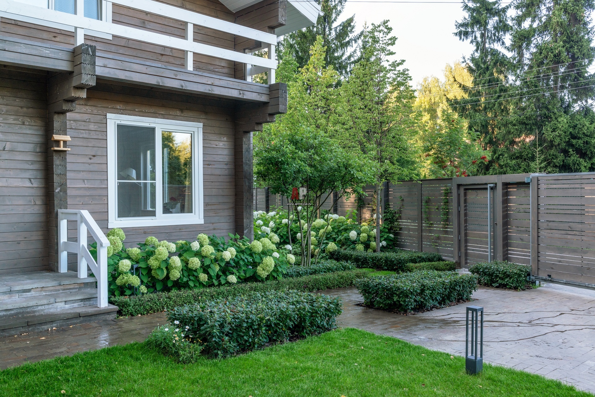 Площадка перед домом облицована нарезанным камнем. В него интегрированы массивы низкорастущих декоративных стриженых кустарников.