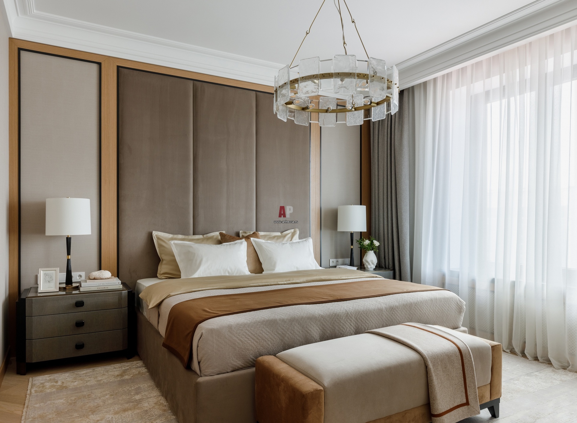 Спокойная квартира для отдыха после работы. Интерьер спальни. Кровать 2 Х 2 метра и мягкие стеновые панели, на заказ. Тумбы Malerba. Светильники, Visual Comfort & Co.