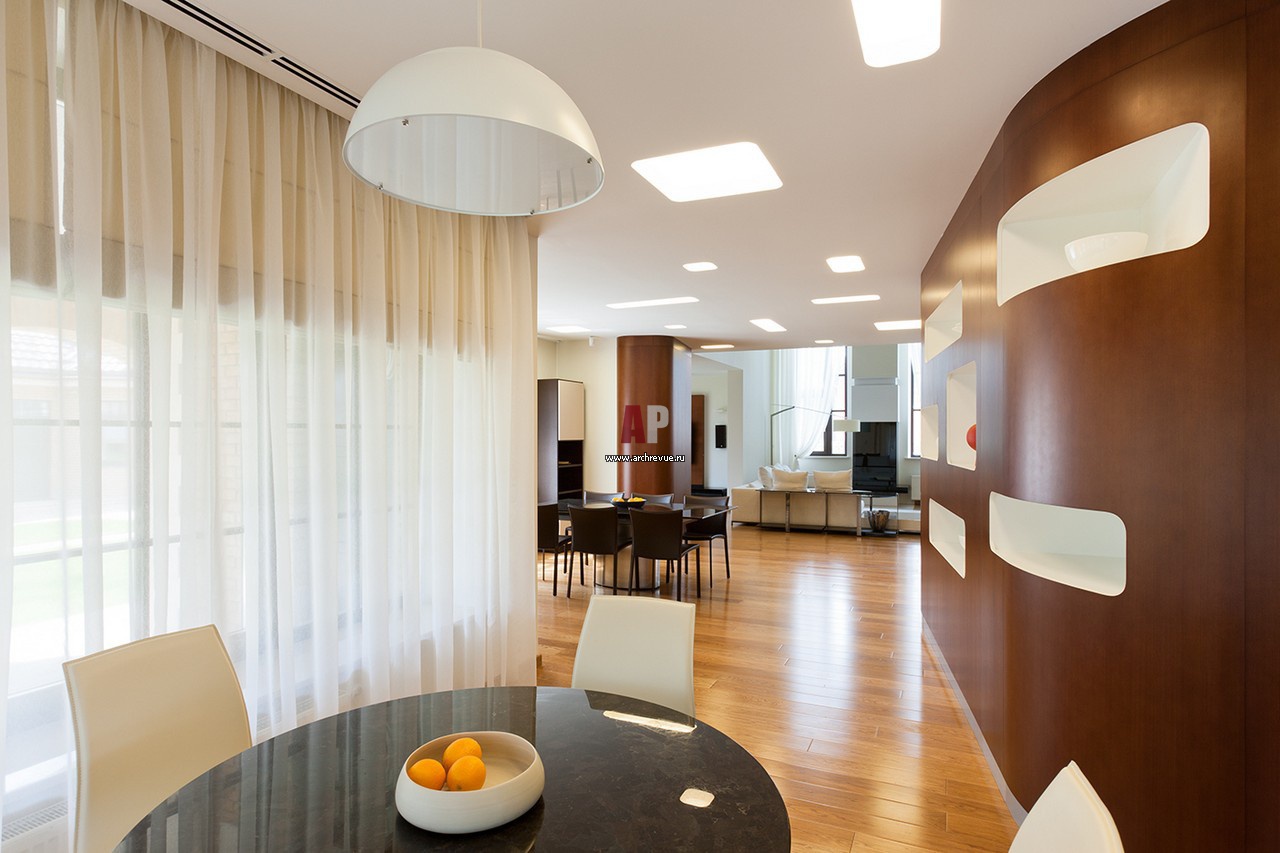 Обтекаемые объемные элементы, зашитые древесиной ореха, зонируют общую гостиную. Один из тех объемов изолирует кухню-столовую от двусветной зоны отдыха.