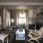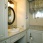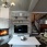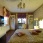 Лестница в небольшом доме находится в гостиной. Она выполнена из дерева: ступени и перила выкрашены в темный цвет, балясины и подступенки – в белый. Трапециевидный портал камина отделан плиткой под состаренный кирпич.