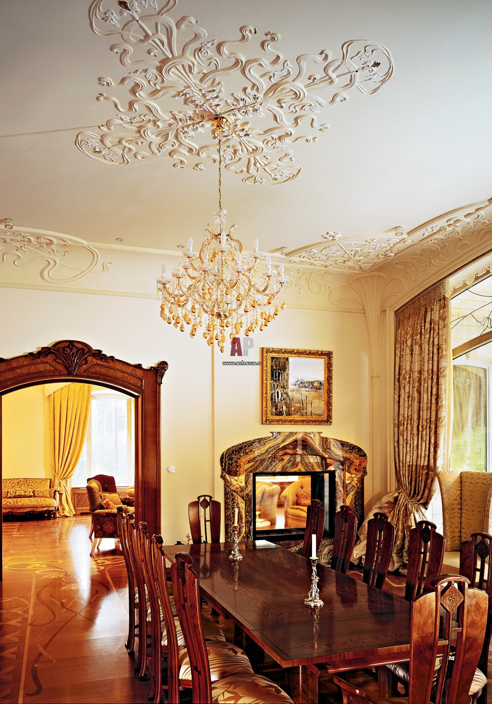 Интерьер столовой в стиле роскошного ар-деко. Широкие дверные проекты оформлены резными порталами янтарного цвета. Столярные изделия выполнены на заказ на фабрике CL Italia.