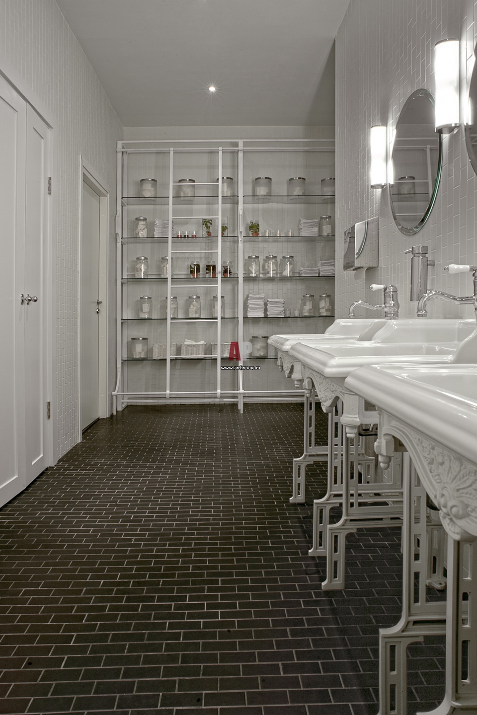 Стеллаж и консоли умывальников выполнены из выкрашенного в белый цвет металла на заказ.