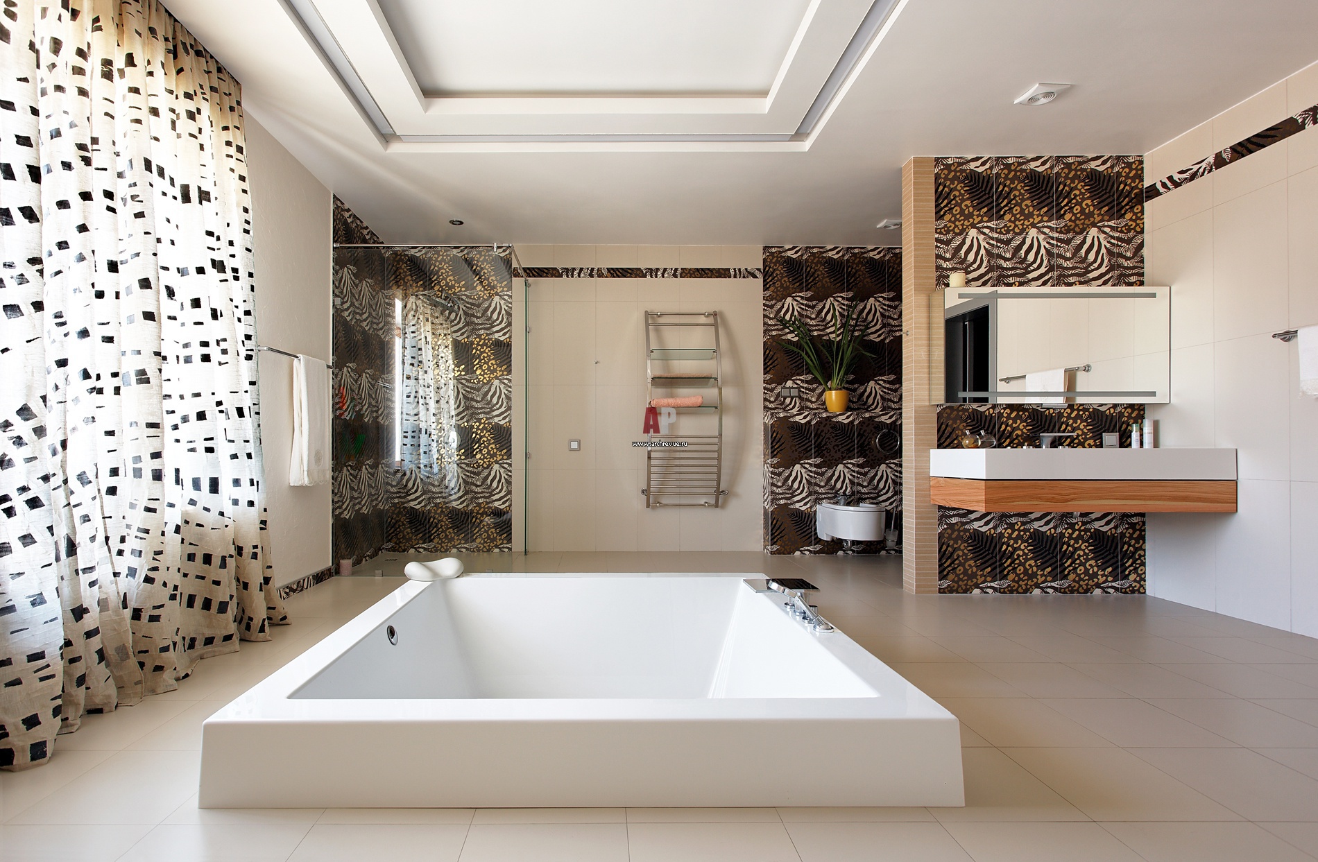 Чаша ванны в хозяйском санузле утоплена в пол так, что ее бортики возвышаются всего на 15 см. Это удалось благодаря тому, что внизу находится техническое помещение, поэтому архитектор имел возможность занизить уровень потолка на 70 см и в получившемся двойном перекрытии разместить ванну.