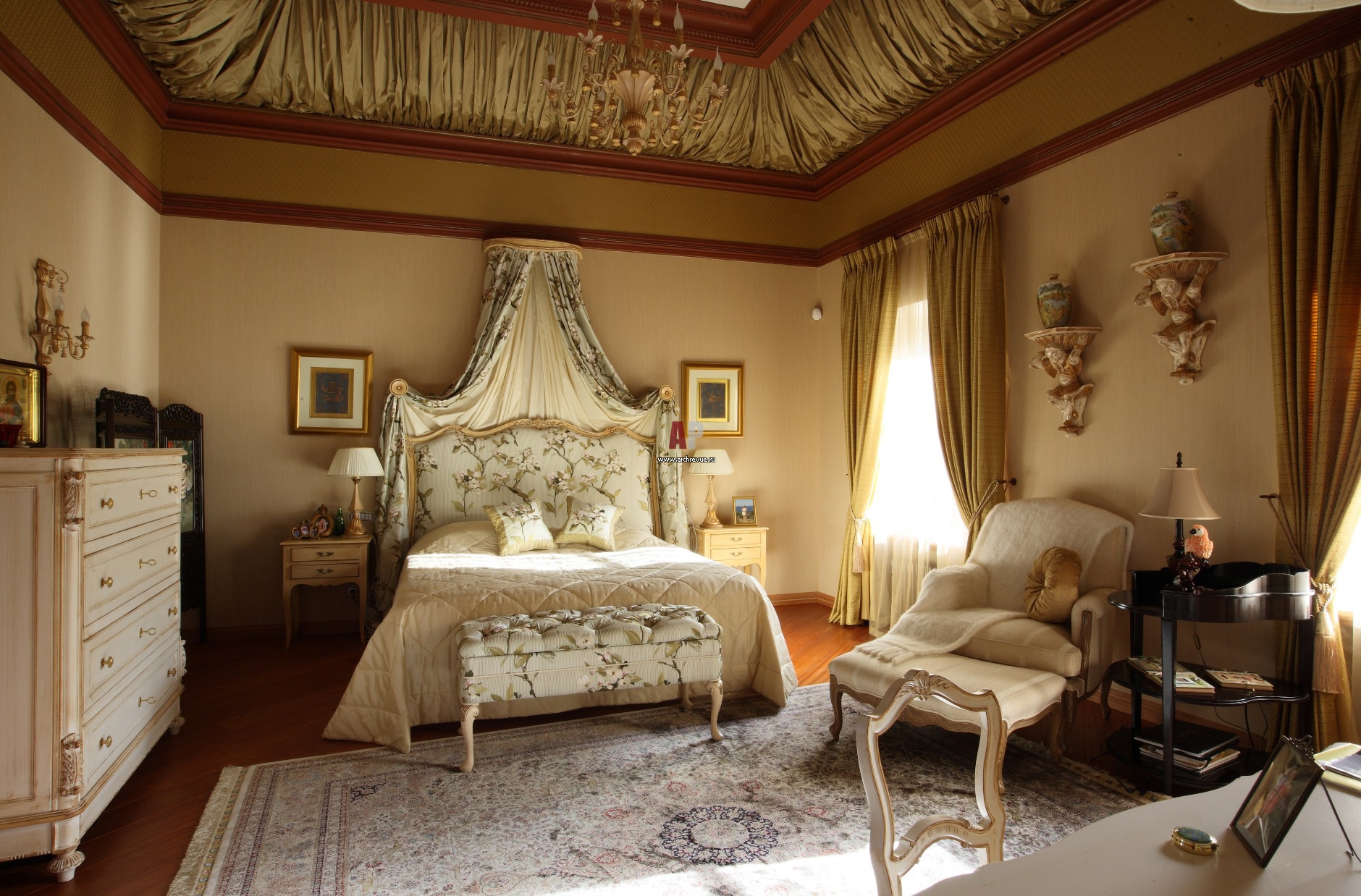 Хозяйские спальни расположены на втором этаже приватного крыла и обращены на внутренний двор. Интерьеры спален выглядят теплыми и уютными, в том числе за счет текстильных обоев и великолепной работы с текстилем.