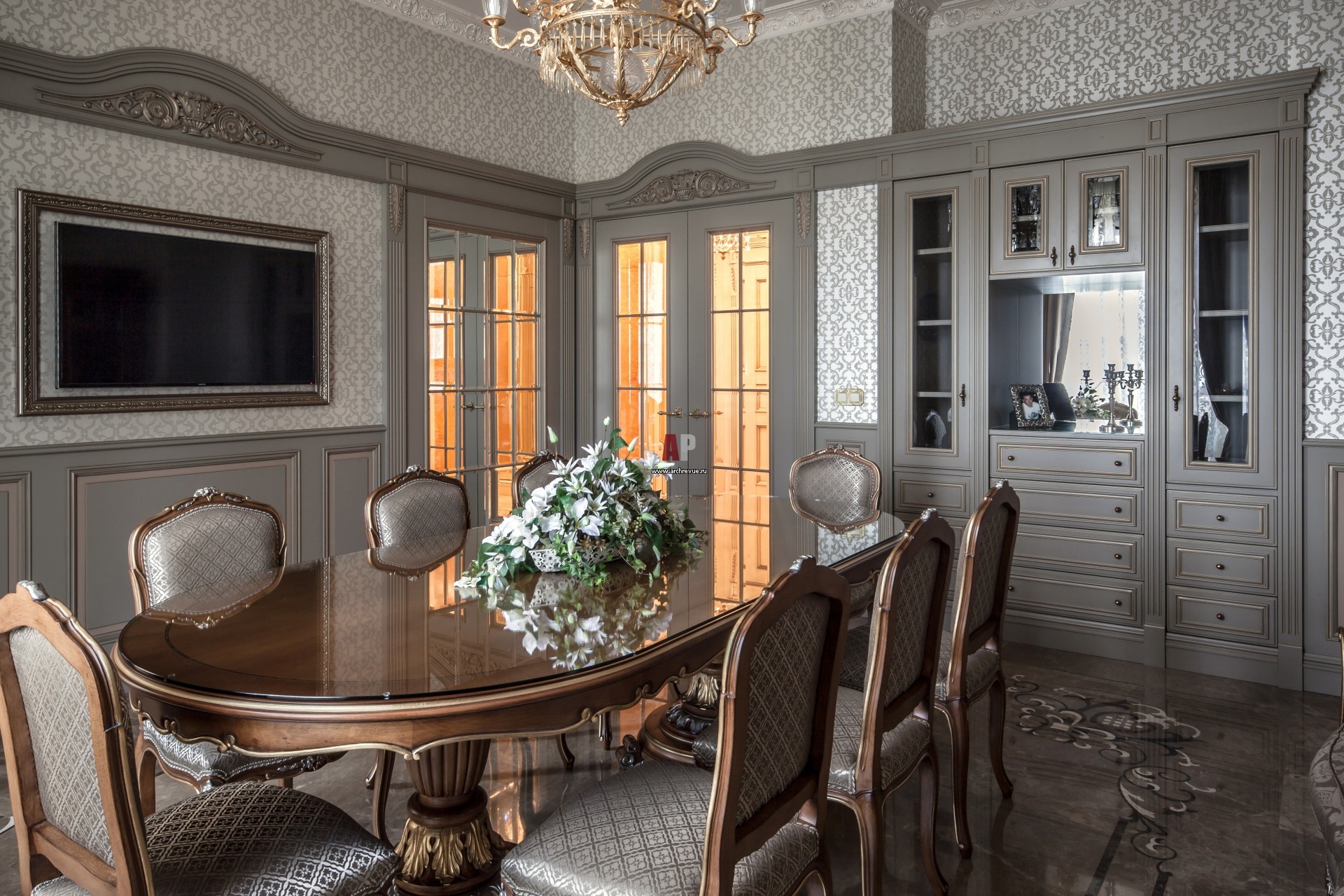 Изолированная семейная столовая выполнена в прохладной серебристой гамме. С переливающейся серебристой шелковой обивкой стен гармонируют буазери и двери соболиного цвета. Люстра, Mariner. Обеденная группа, Angelo Cappellini.