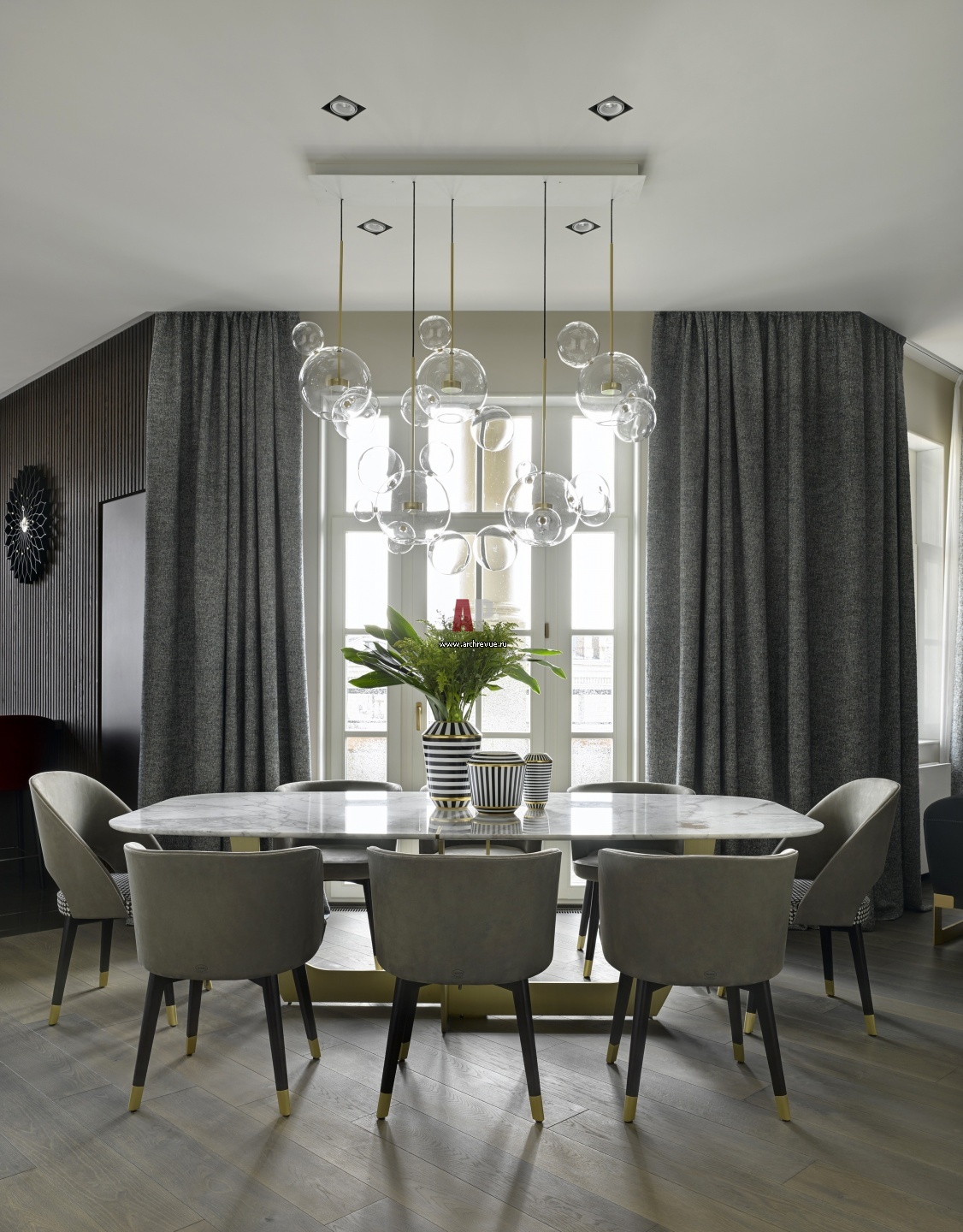 На одной линии с прихожей расположена столовая группа. Над столом с мраморной столешницей «парит» стеклянная люстра, напоминающая облако.