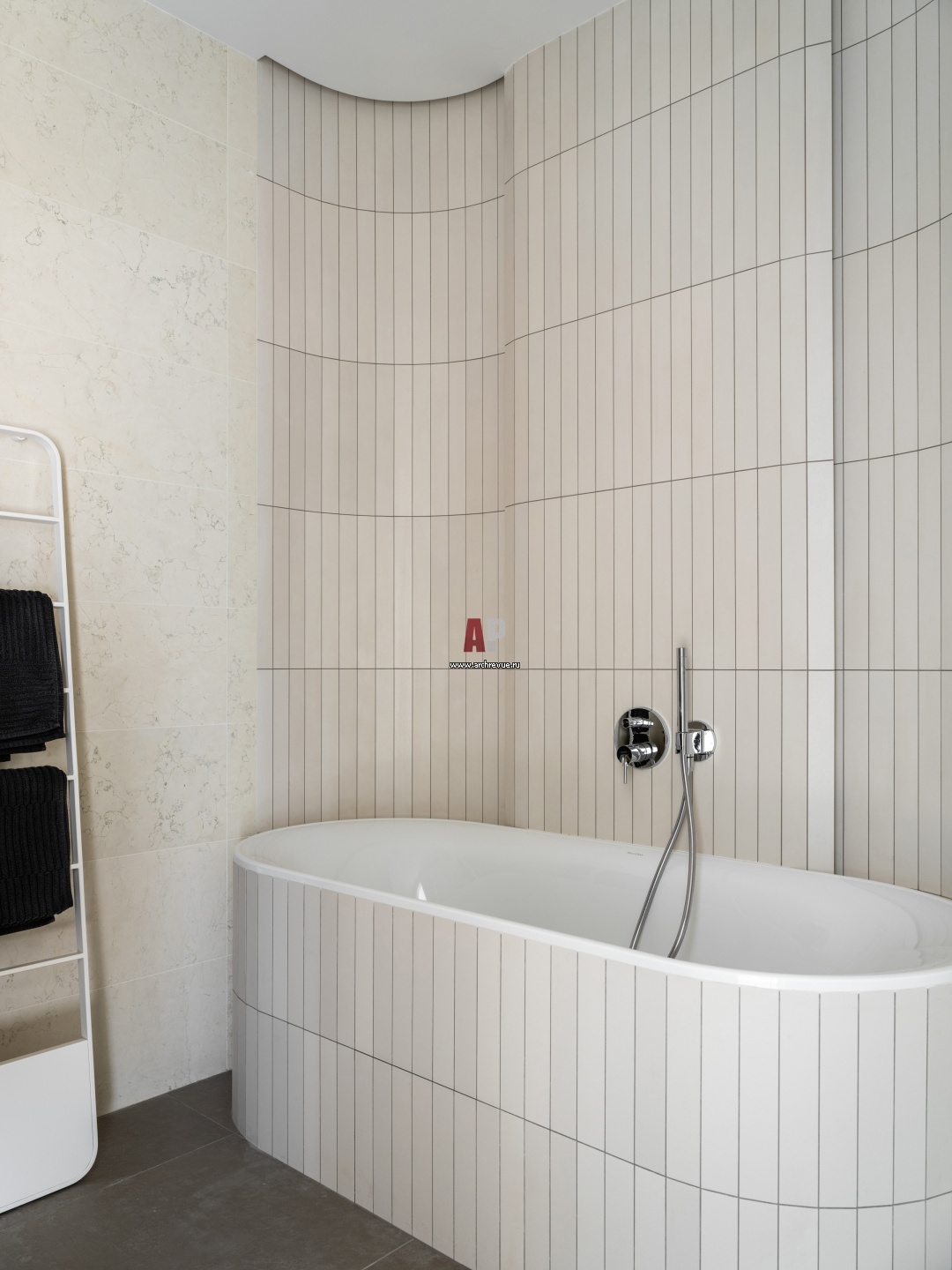 Хозяйская ванная комната исполнена в светлой палитре. Ванна Villeroy & Boch встроена в нишу, оформленную плиткой, Mutina. Края ниши скруглены.