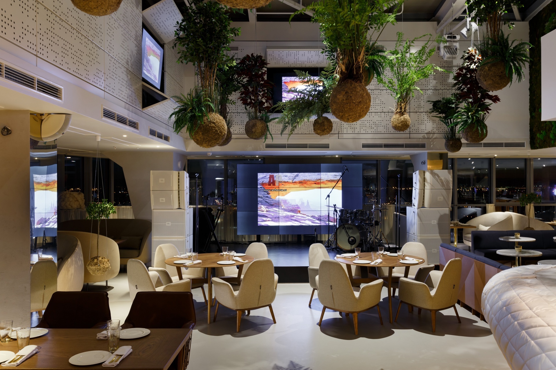 В ресторане спроектирована цена для живых выступлений музыкантов с мобильным экраном, профессиональным звуковым и световым оборудованием.