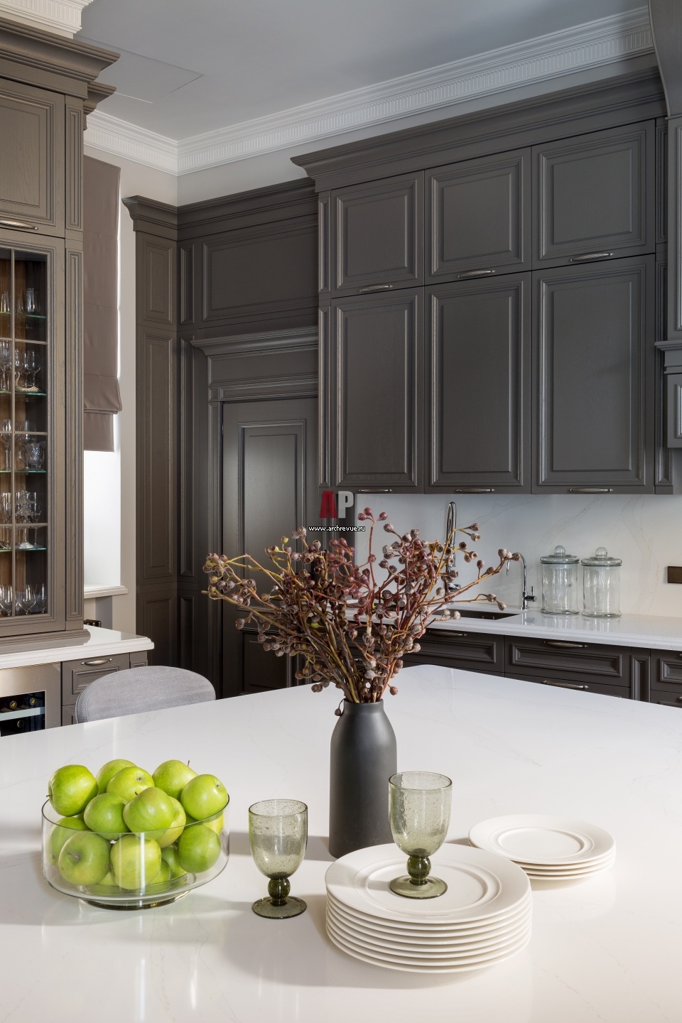 Интерьер кухни в двухэтажной квартире с элементами классического стиля. Кухонный гарнитур, Old Line. Столешницы, фартук – светлый мрамор.
