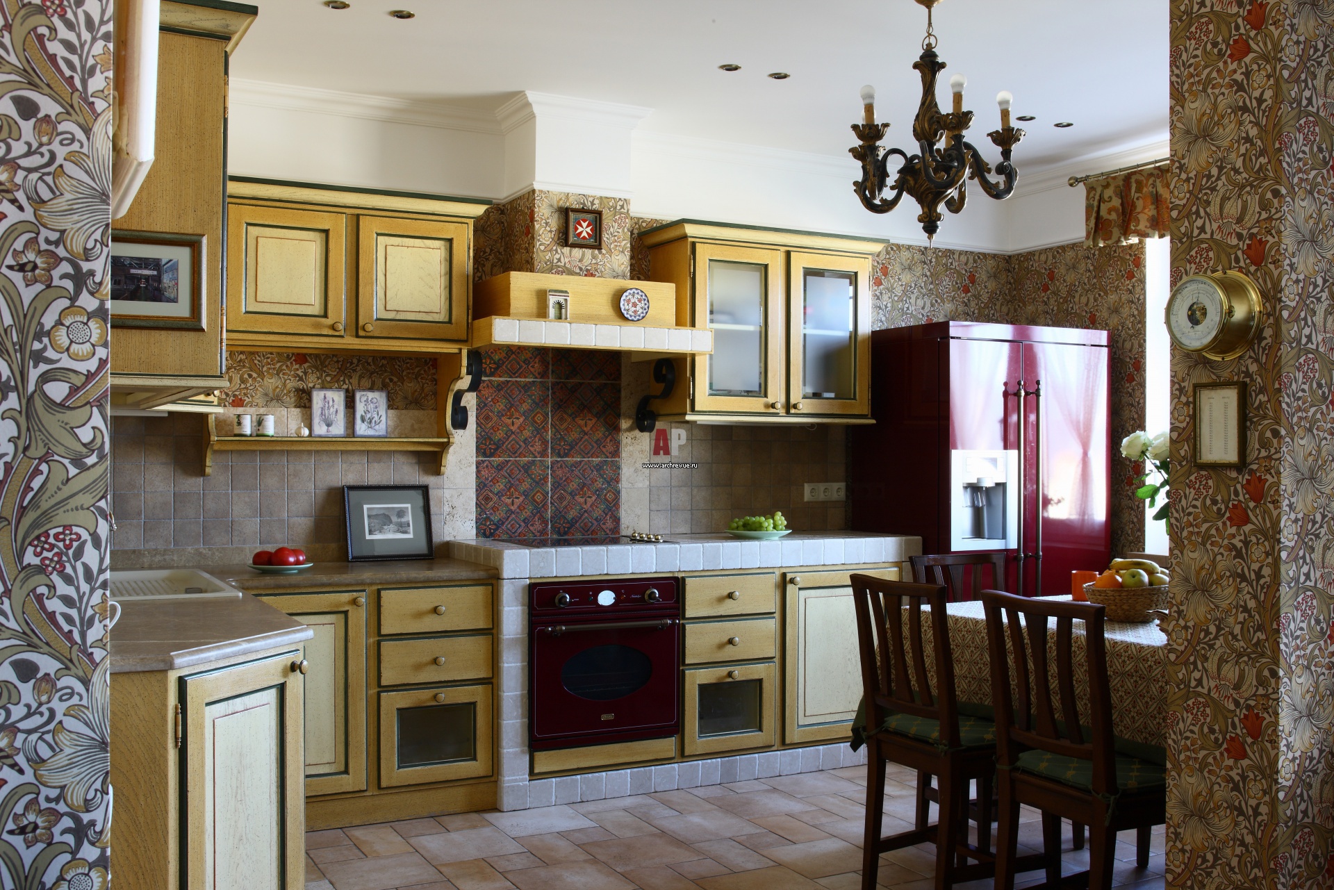 Кухня выглядит яркой и пестрой благодаря миксу из разных материалов, фактур и орнаментов: обоям в цветочек, грубой плитке с керамическими вставками, бытовой технике насыщенного брусничного цвета. Кухонный гарнитур в светлом дереве, Bamax.
