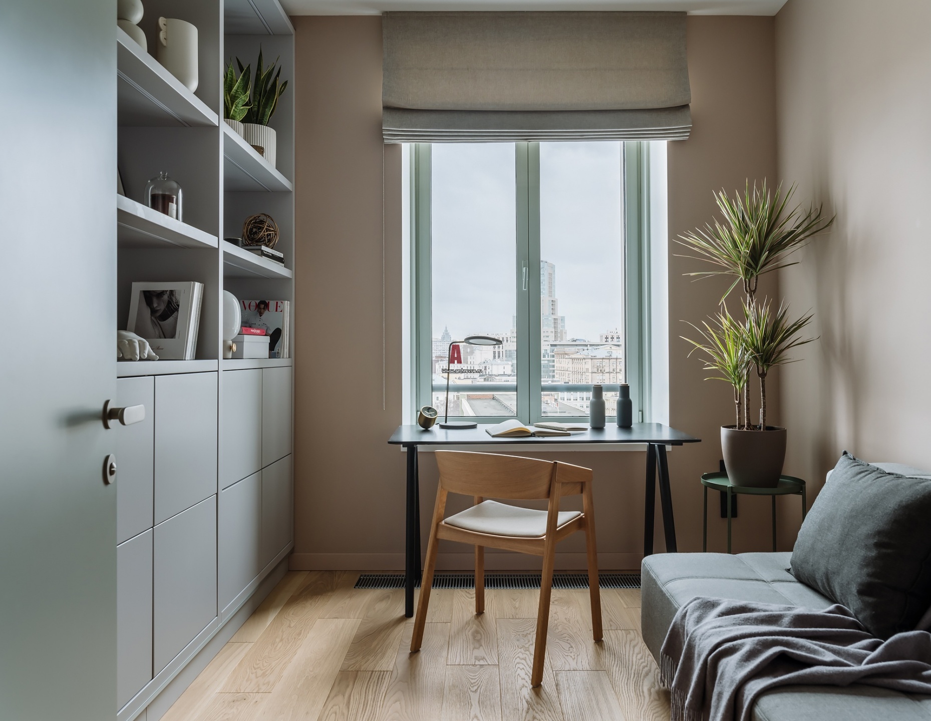 Кабинет. Стены спальни выкрашены краской, Paint & Paper Library. Письменный стол, Hay. Диван, Northern. Стул, Muuto.