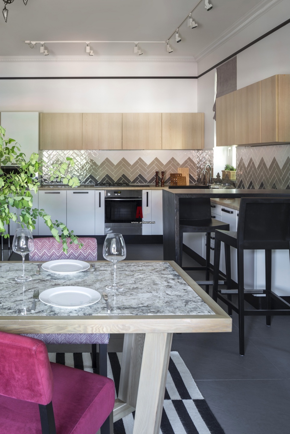 Кухня выполнена на заказ. Технический свет, Paulmann. Фартук облицован плиткой Equipe Ceramicas. На полу – темно-серый керамогранит, Villeroy & Boch.