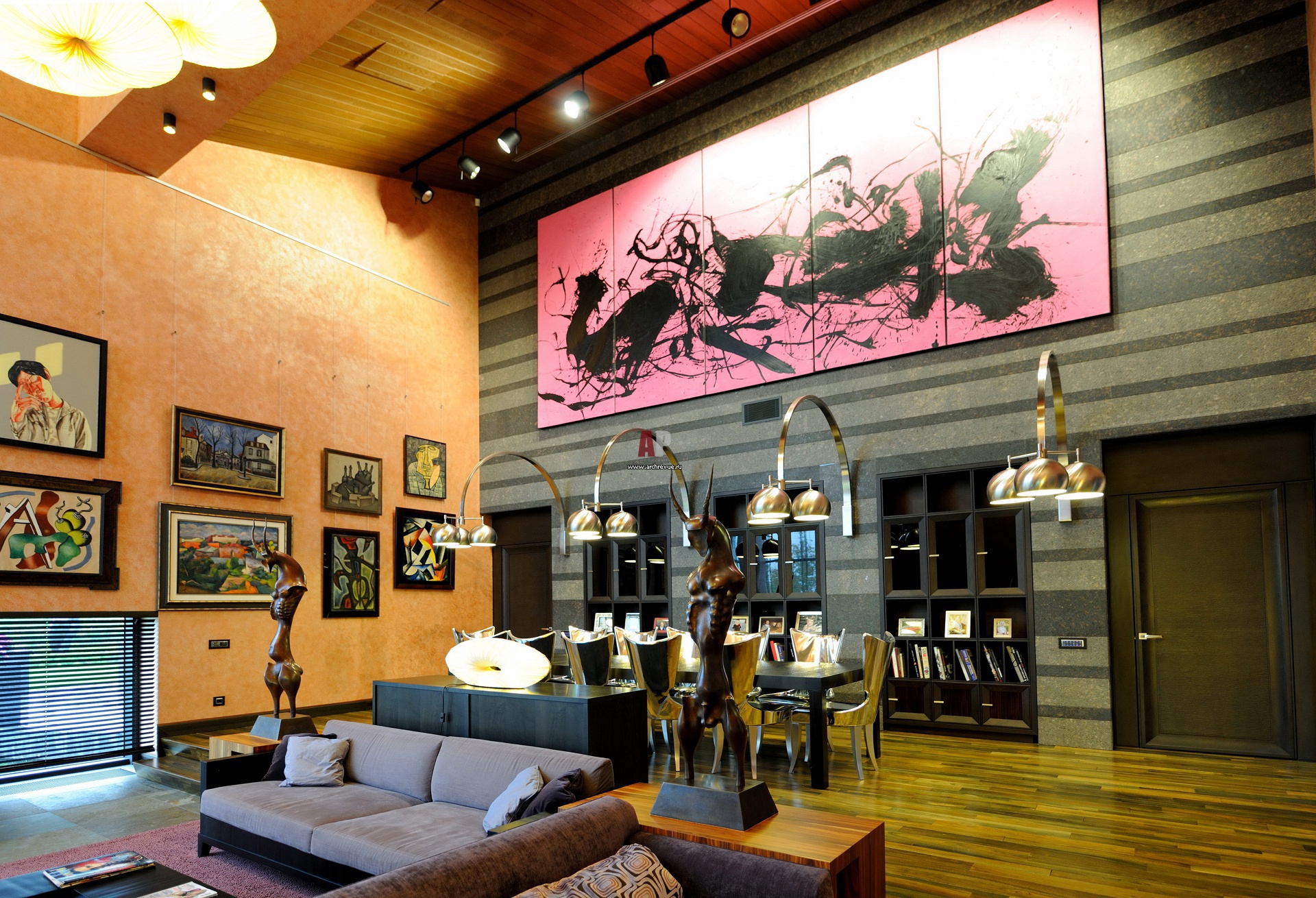 Двухуровневая гостиная. Столовая группа вынесена на подиум. Стена с книжными стеллажами оформлена гранитом Tan Brown. На стенах – работы Марка Шагала, Александры Экстер, Фернана Леже, Андре Ланского.