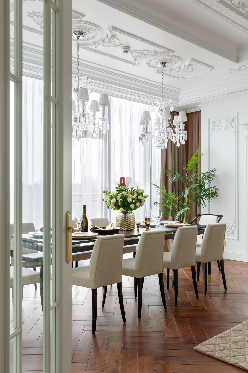 Обеденная группа в стиле американской классики. Стены гостиной выкрашены белой акриловой матовой эмалью Ultrasaten, Oikos. На полу – паркет «елочка» из массива ореха.