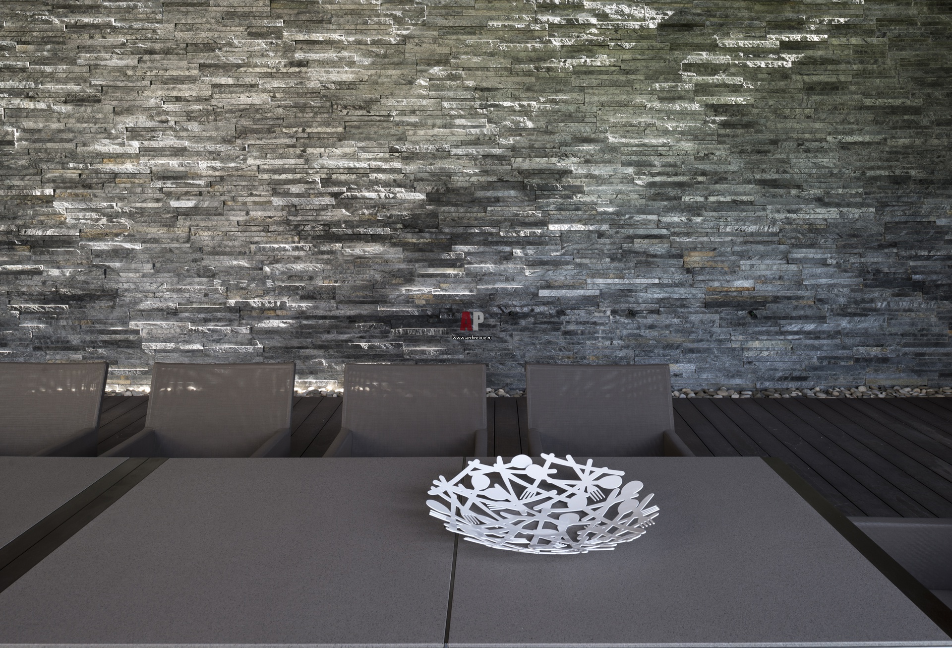 На фото – открытая веранда. Стена за столом выложена узкой литкой из сланца серо-стального цвета. Настил выполнен из искусственной террасной доски, по краю насыпана галька.