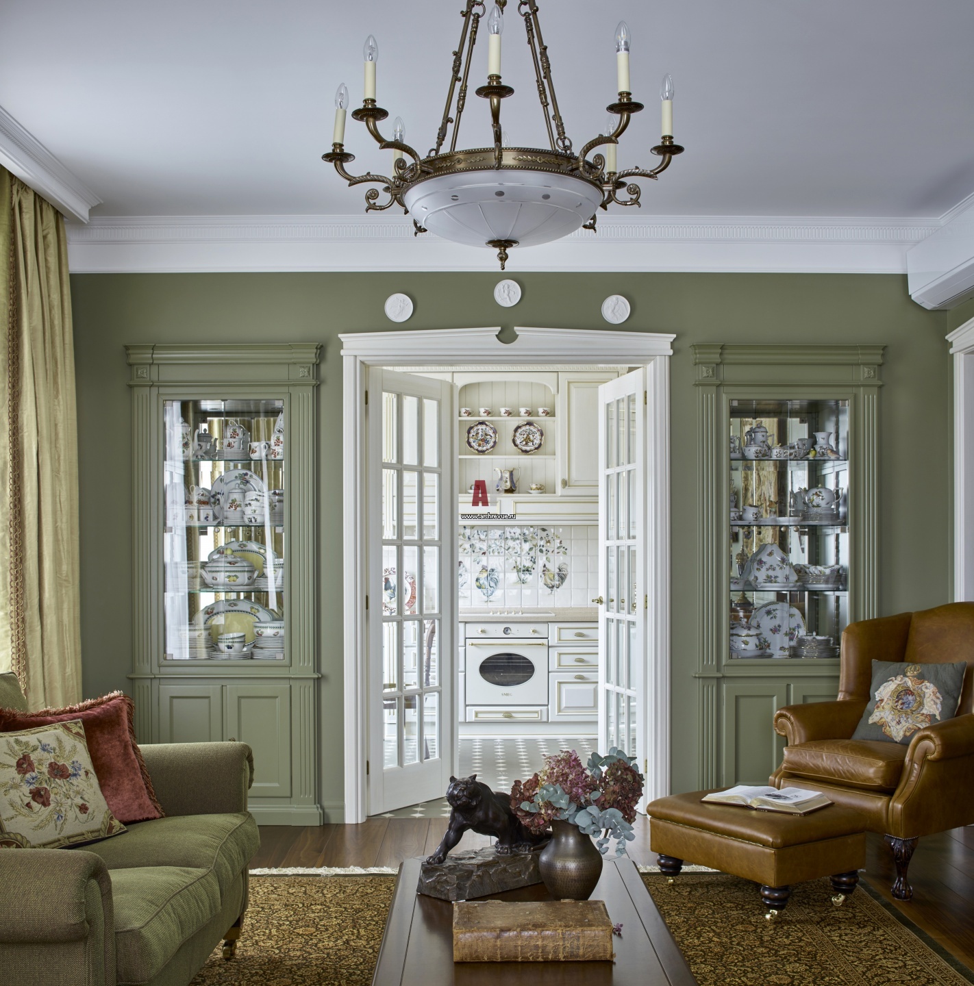 Хозяева попросили сделать изолированную кухню, которую можно при необходимости закрыть. Но благодаря большим распашным дверям и шкафам, которые за счет зеркальных задников выглядят сквозными, кухня кажется естественным продолжением гостиной. Симметричные витрины с зеркальными задниками сделаны на заказ.