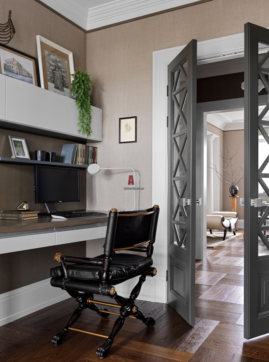 Эклектичная квартира в сталинке. Интерьер кабинета. Встроенная мебель выполнена на заказ. Кресло, Theodore Alexander. Однотонные обои с фактурой ткани, Sirpi.