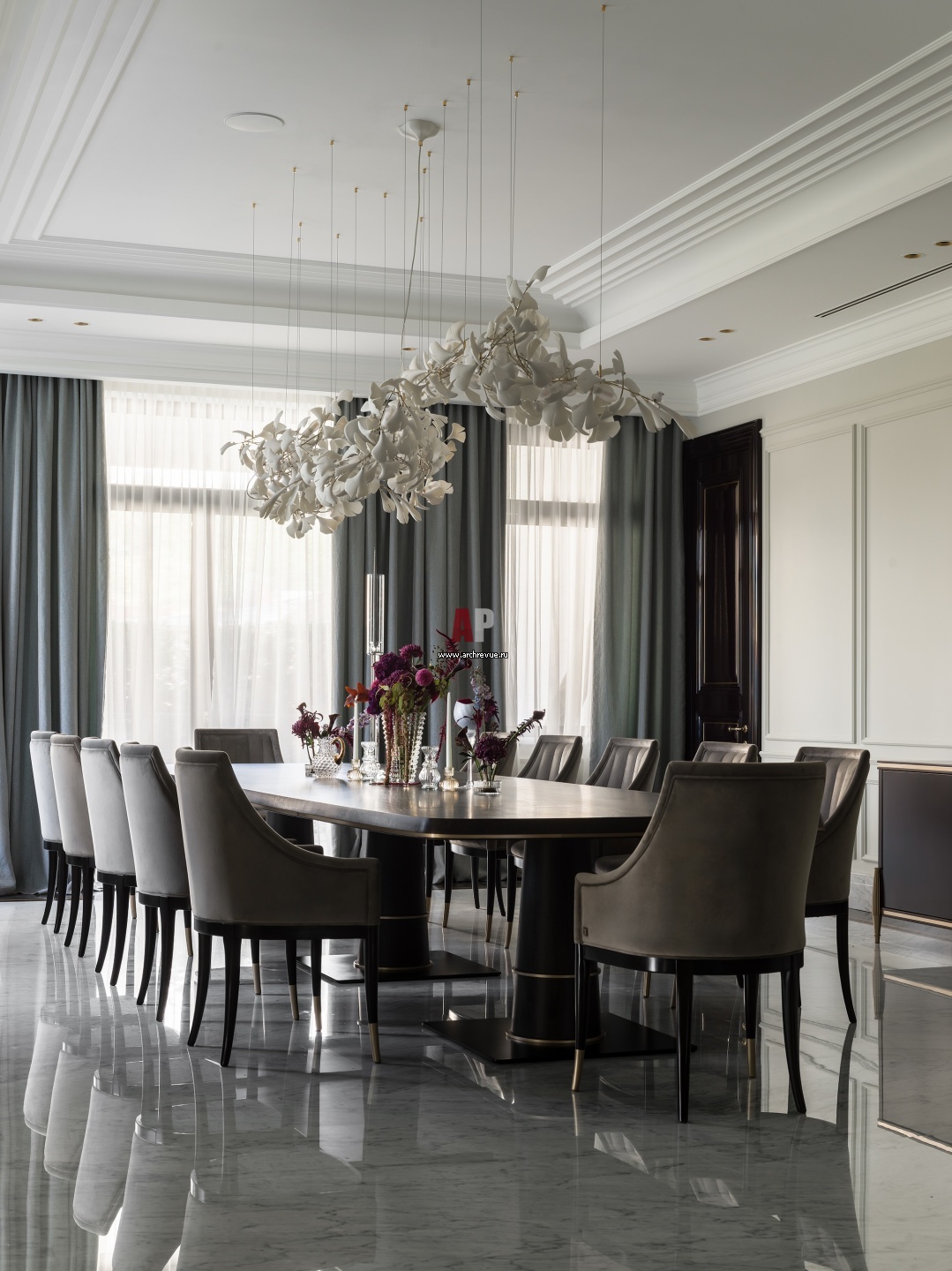 Парадная столовая. На полу – светлый полированный мрамор. Обеденный стол на 12 человек, Medea.