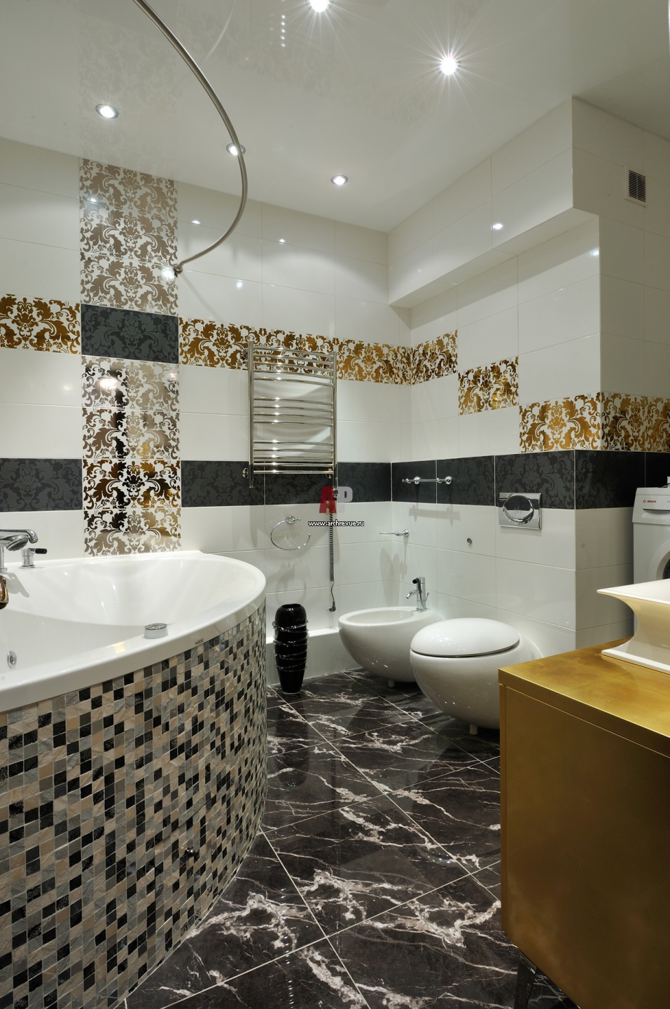 Интерьер санузла. Ванна облицована мозаикой. Сантехника, Oasis (Италия), Laufen, коллекция Alessi (Австрия).