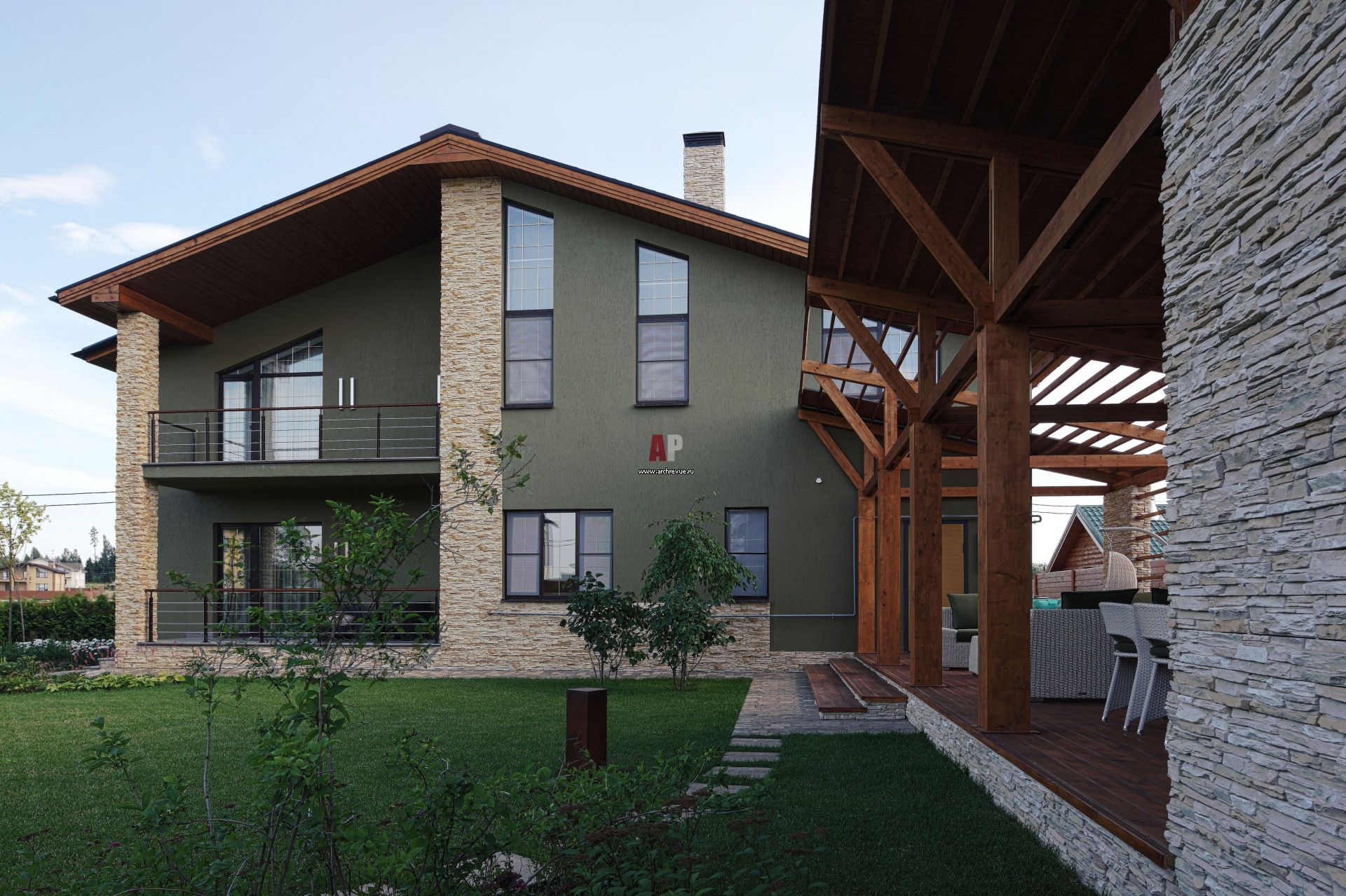 К основному объему была пристроена просторная деревянная беседка с летней кухней и зоной отдыха.