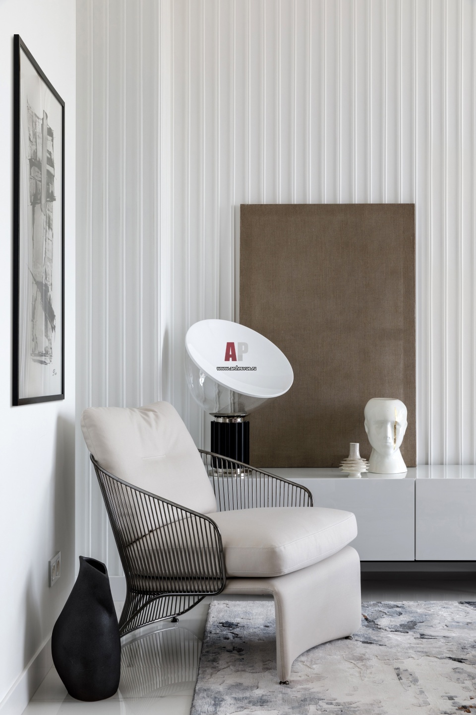 Панорамная квартира с легким настроением для молодой пары с двумя детьми. Интерьер белоснежной гостиной. Кресло, Minotti, модель Colette. Настольный светильник, Flos, модель Taccia. Графика – художник Софья Пятницкая.
