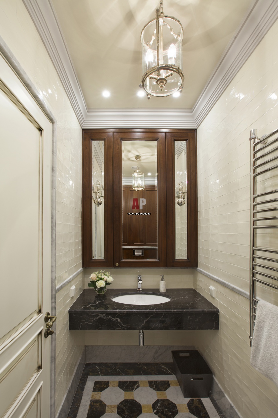 Фото интерьера маленького санузла. Стены облицованы белой керамической плиткой с глазурью. Полы выложены мрамором. Навесной шкаф над умывальником с удлиненными дверцами сделан из тонированного дуба.