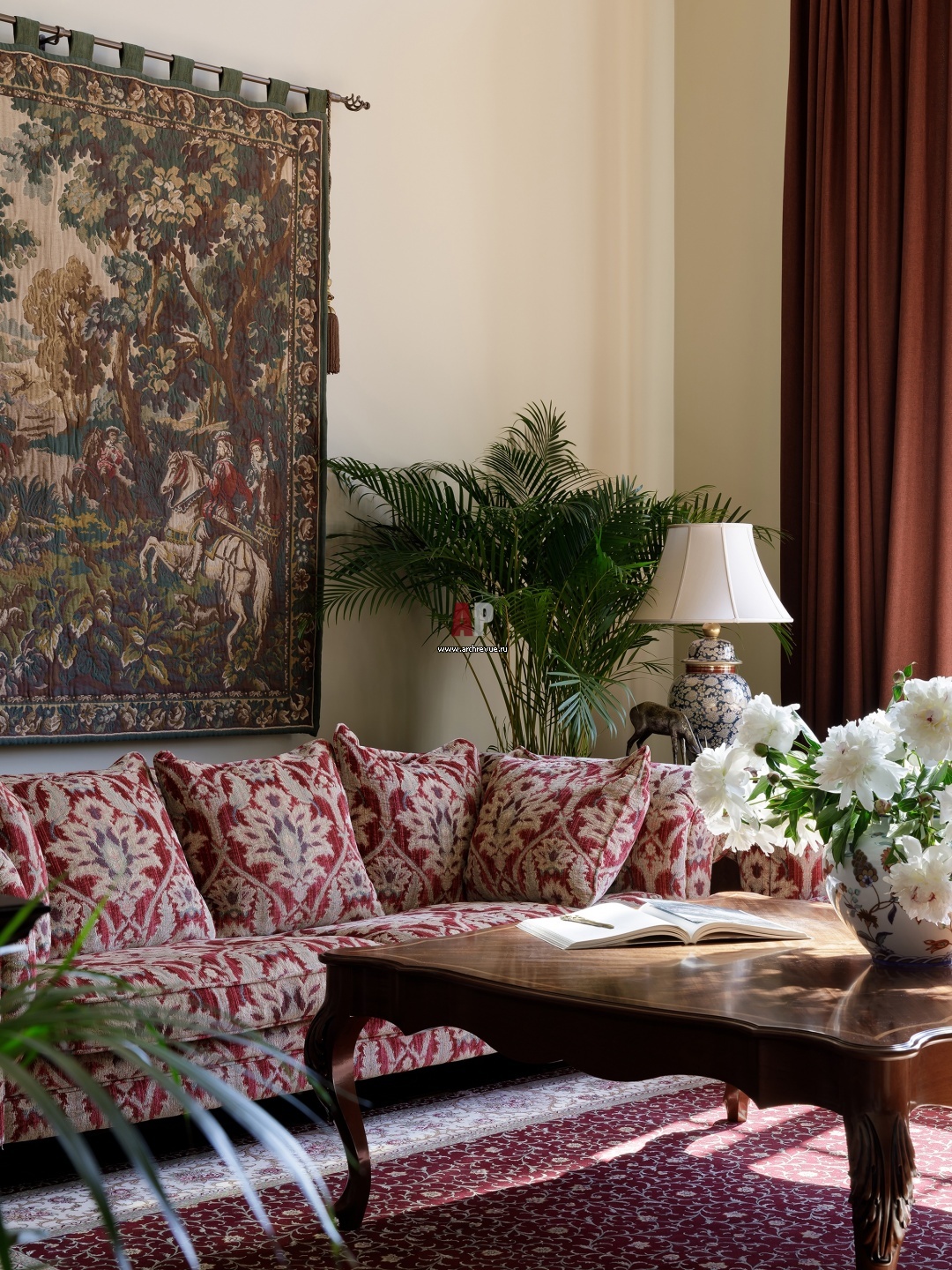Интерьер гостиной в английском стиле. На стене за диваном – антикварный гобелен.