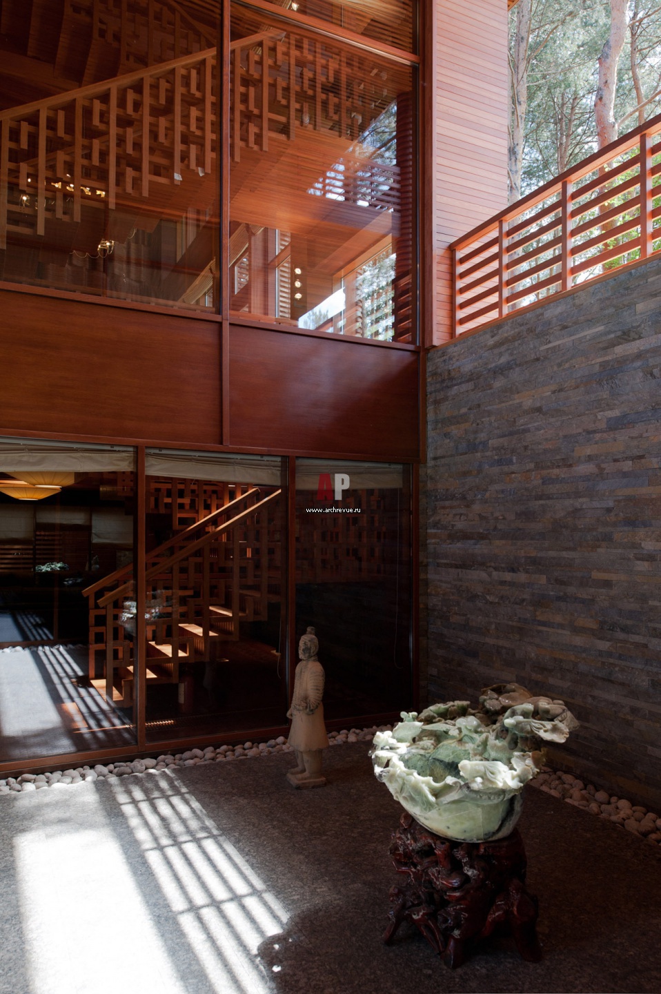 Подвал в полноценный этаж помогли превратить два атриума – внутренних двора. В одном из них сделан сад камней с традиционной каменной китайской скульптурой.