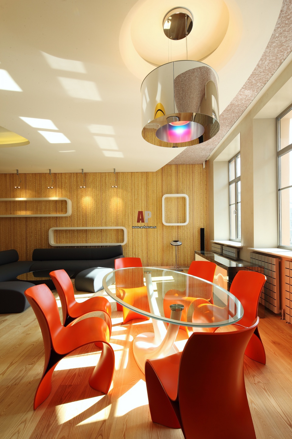 Столовая группа в ультрасовременной квартире. Стол Cattelan Italia с прозрачной стеклянной столешницей. Стулья от Moroso сделаны исходя из особенностей человеческого тела. Светильник над столом, Artemide.