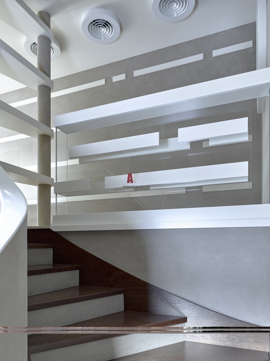 Лестничный холл третьего этажа оформлен в стиле 1960-70-х годов. Ограждения из стекла украшены декоративными элементами в виде пунктирных линий.