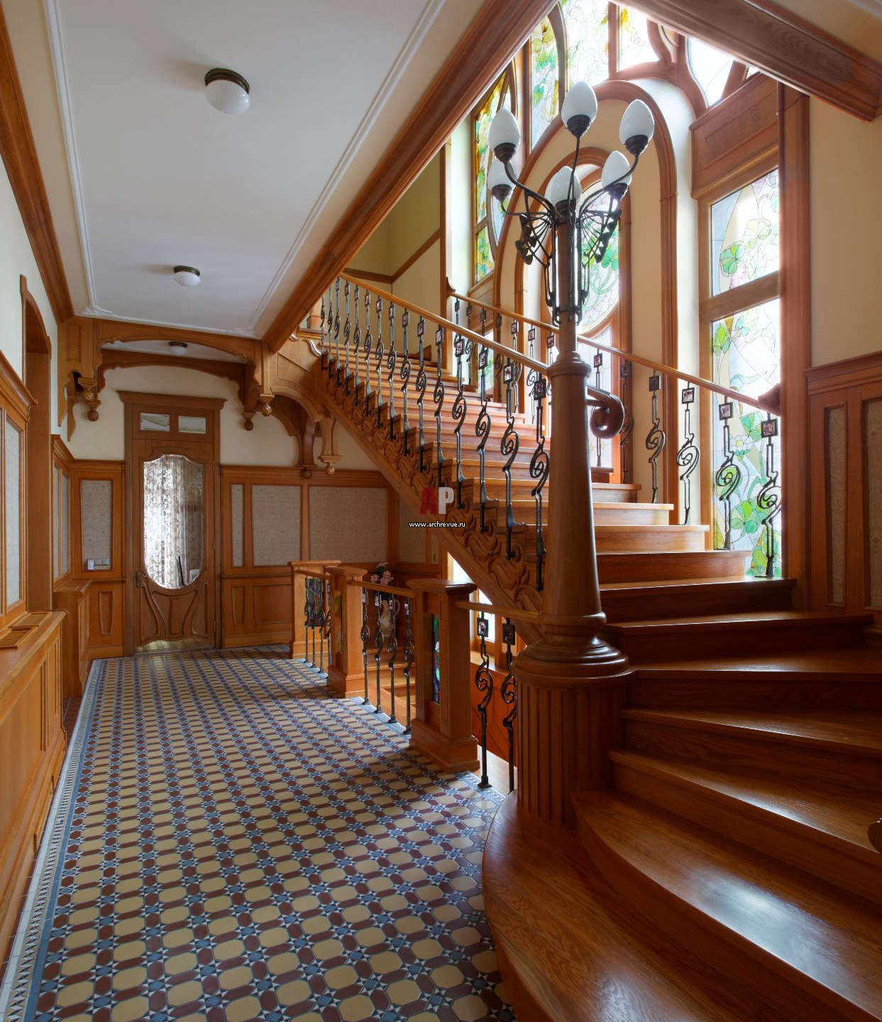 Лестничный холл на первом этаже. Лестница выполнена по эскизам архитекторов мастерами компания «Квалити » и украшена декоративным фонарем. На полу – португальская плитка с характерным для модерна орнаментом.