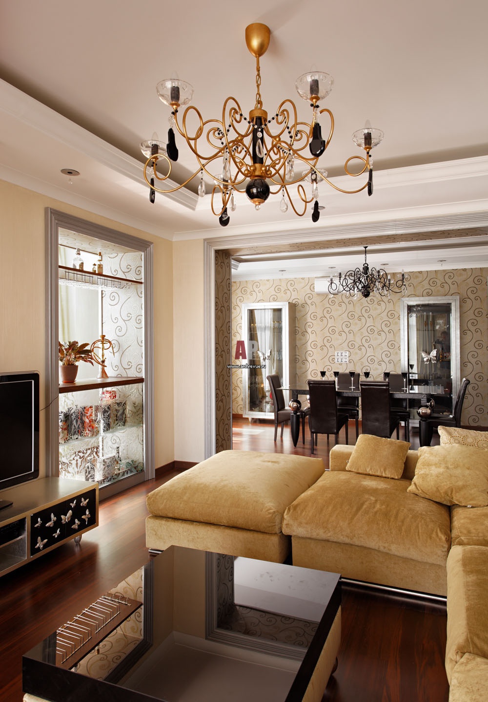 С серебряным обрамлением порталов рифмуется лепной декор потолков. Лепные карнизы с нейтральным узором, поставщик «Ампир Декор».