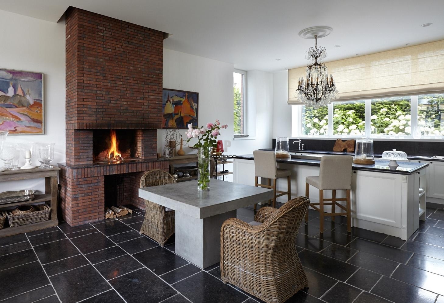 Яркий акцент кухни – брутальная печь-камин, сложенная из красно-коричневого кирпича. Элемент атмосферный и предельно функциональный.