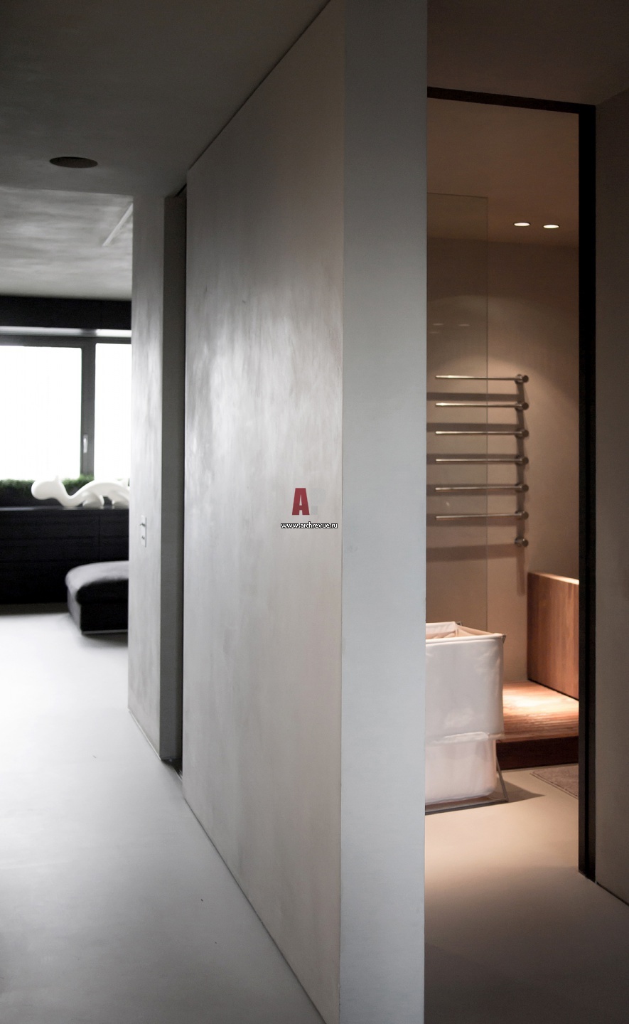 Фрагмент современного монохромного интерьера. Вид из коридора на гостиную.