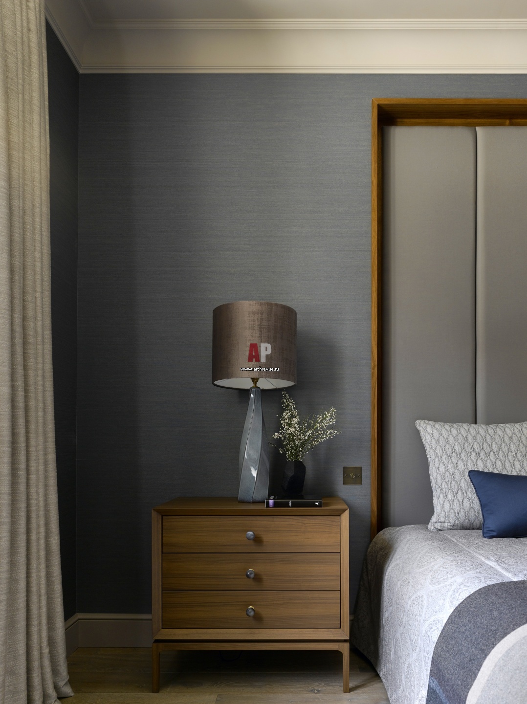 Хозяйская спальня. Кровать встроена в конструктивную нишу. Высокое изголовье сделано на заказ. Текстильные обои, Omexco. Светильник, Heathfield & Co. Шторы и покрывало, Mark Alexander. Подушки из ткани Pierre Frey.