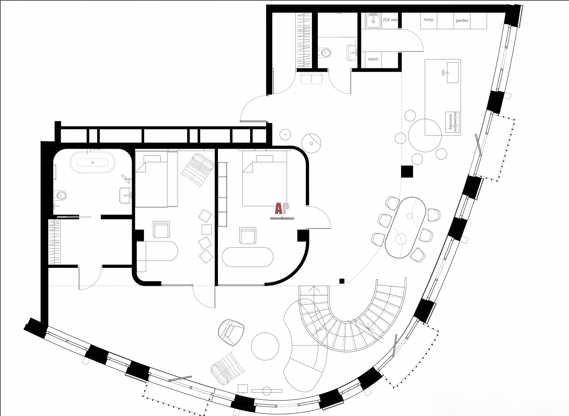 Двухэтажная квартира с радиусной планировкой и скульптурной лестницей