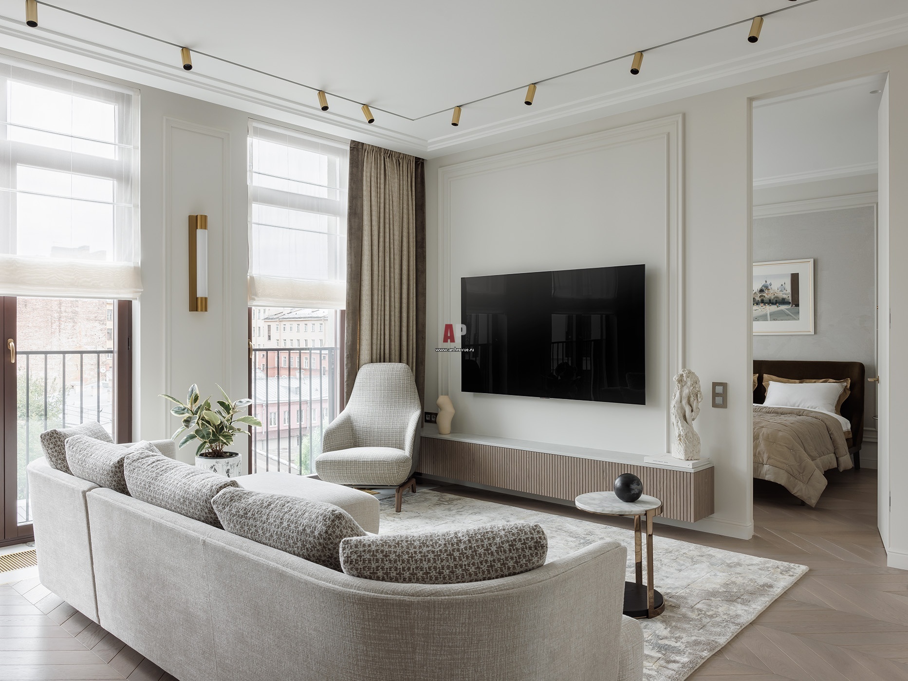 Интерьер гостиной выдержан в светлых, мягких оттенках. Архитектурный свет подчеркивает геометрию помещения и придает пространству строгость. Диван, Molteni &C. Кресло, Giorgetti. Столик, Giulio Marelli.