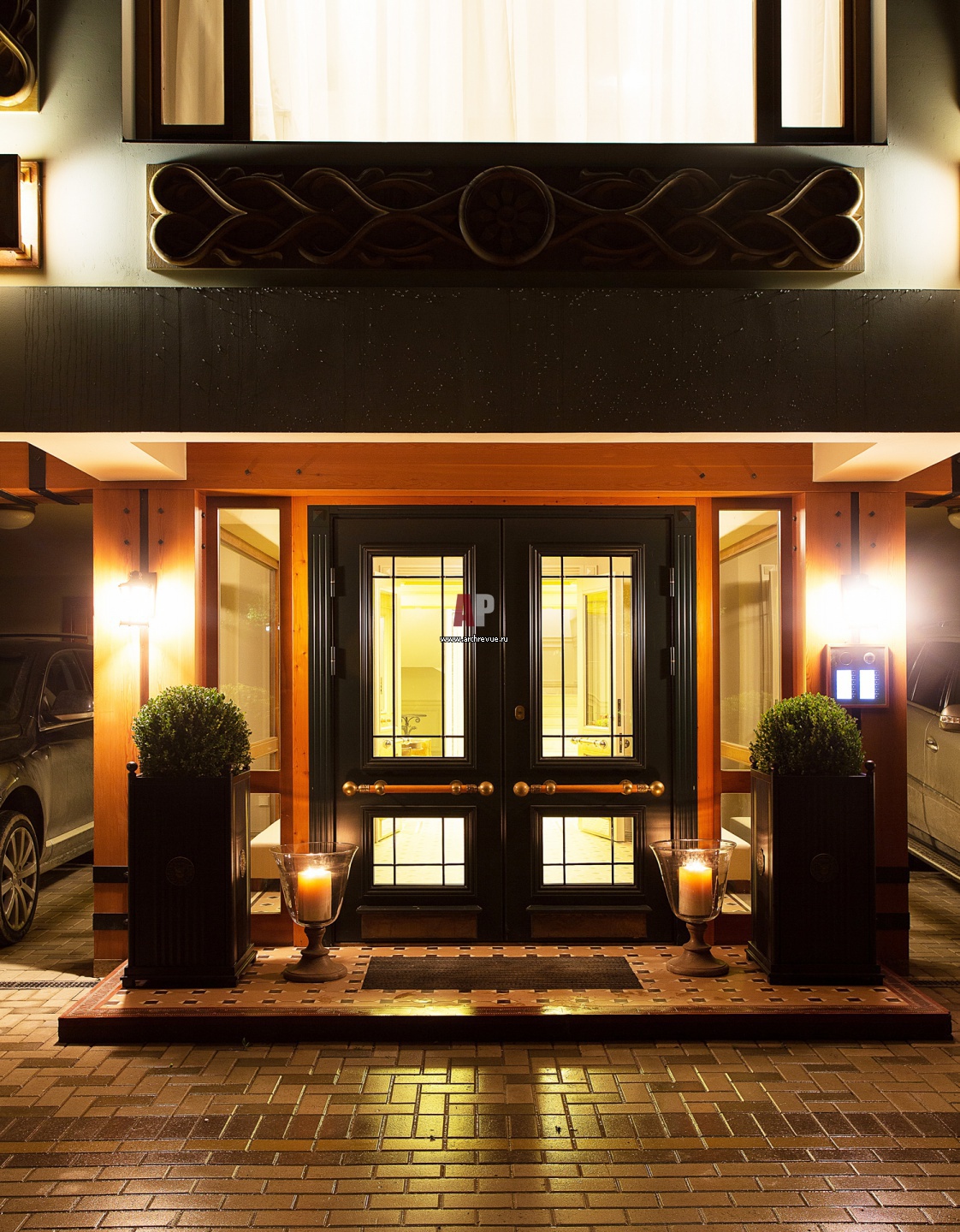 Фасад камерного апарт-отеля в горах. Двери входной группы сделаны на заказ в английском стиле.