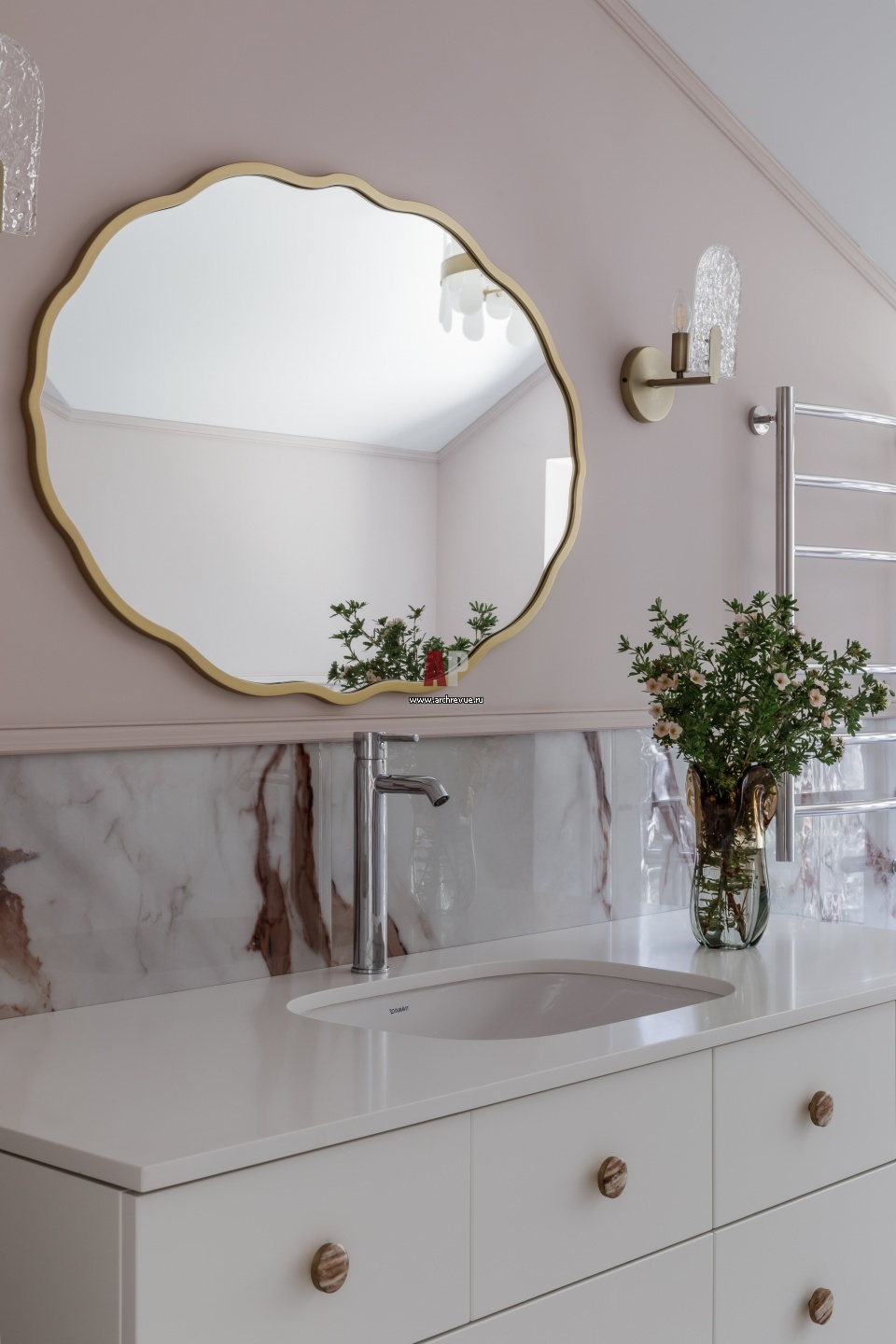 Хозяйский санузел на втором этаже оформлен в пастельной розовой палитре. Сантехника, Duravit.