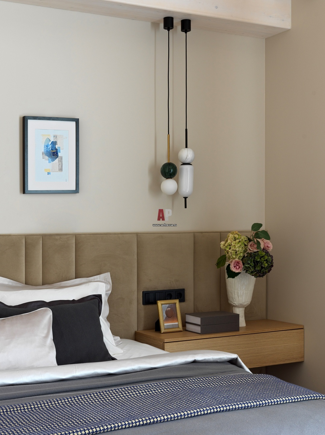Изголовье кровати в спальне сделано на заказ. Подвесные светильники, Aromas del Campo. Краска, Little Greene.