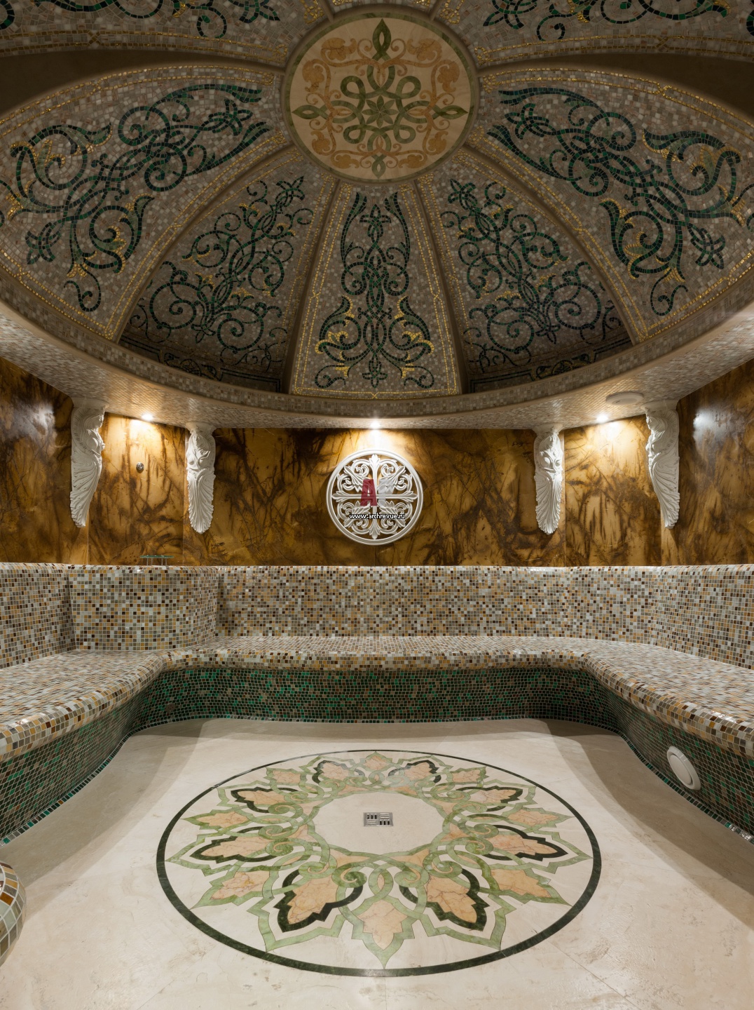 Дизайн хаммама и куполом. Потолок и лавки выложены мозаикой, стены и пол облицованы натуральным камнем. Купол и пол оформлены мозаичными розетками в мавританском стиле по индивидуальному дизайну.