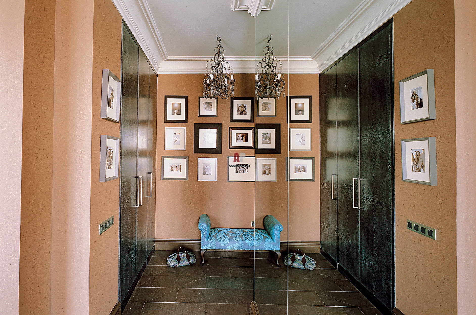 Акцент входной зоны – стена, оформленная фотографиями в тонких рамах. Полы выстланы индийским сланцем, поставщик GS ART. Встроенный шкаф исполнен мастерами компании Beni.
